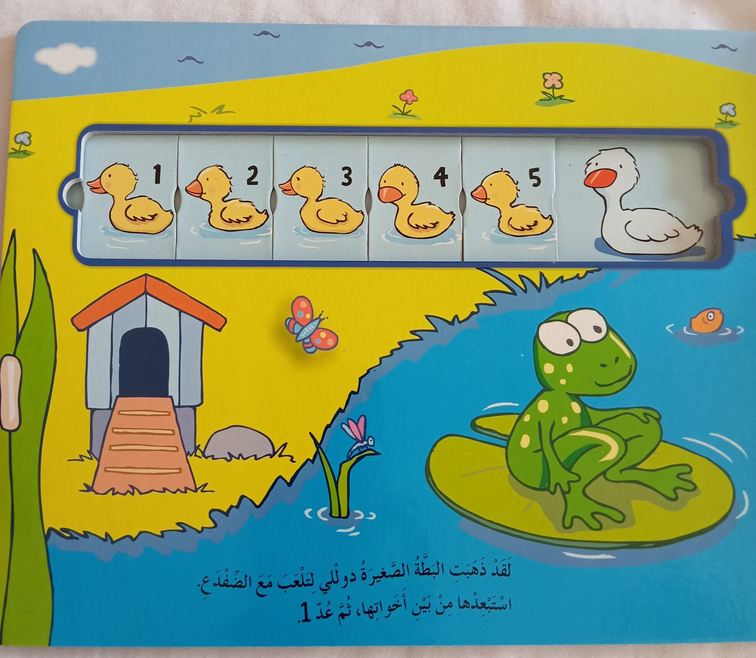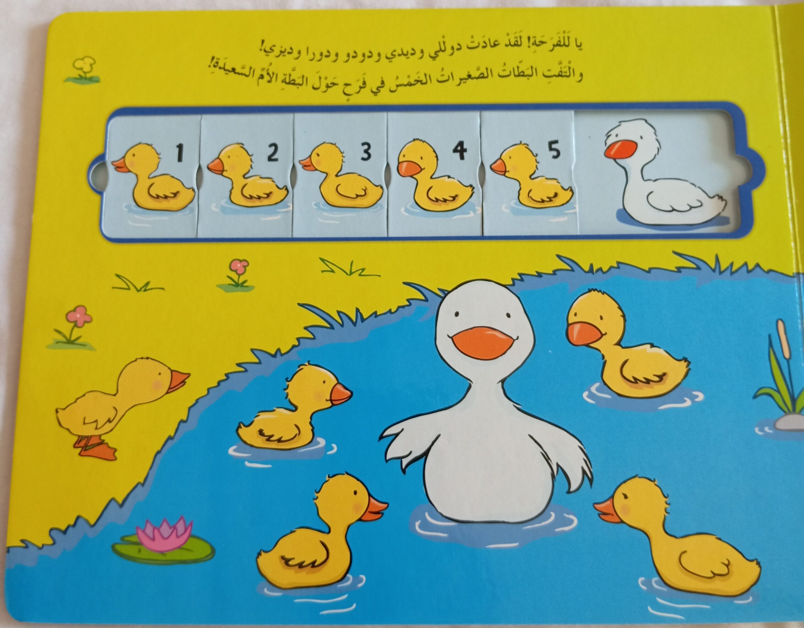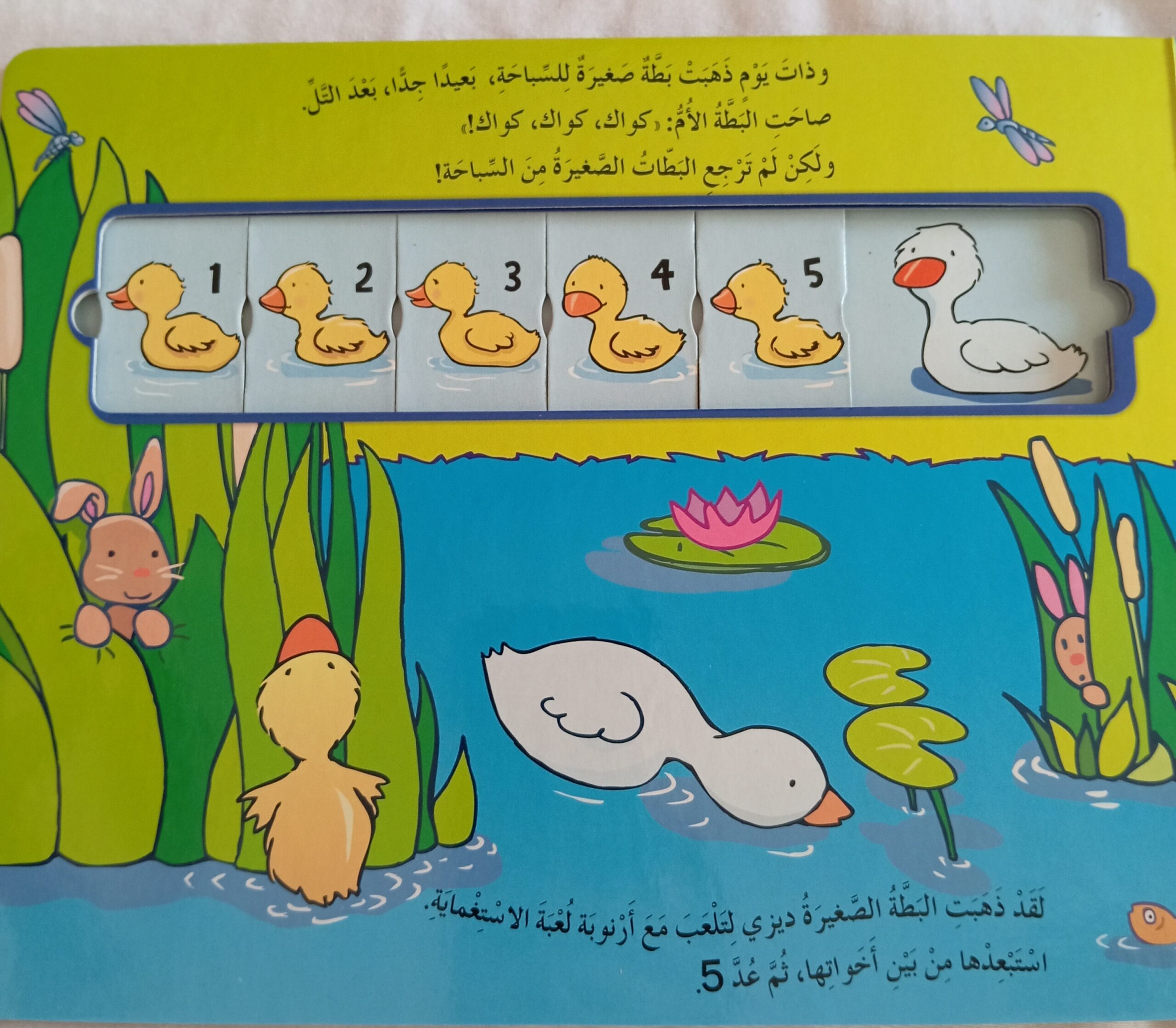 القصه الشهيرة لخمس بطات صغيرات يتوهم من المهن واحده تلو الأخري ثم تجدهم الام بطه ويساعدها الطفل في ذلك باستخدام عداد الارقام المتحرك